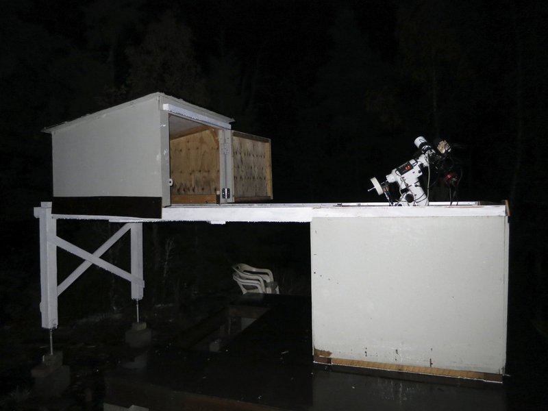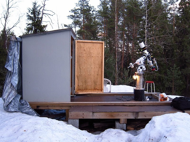 Komakallion havaintosuojalle tehty muunnosprojekti on viimein saatu päätökseen ja kuvaussysteemi on saanut ensivalonsa. Rakennusprojektin valmistuminen kesti lopulta pidempään kuin oli suunniteltu, pitkälti kiireiden ja huonon sään vuoksi, mutta osittain myös allekirjoittaneen laiskuuden takia. Projektissa olivat merkittävänä apuna ainakin Antti Kuntsi, Kaj Wikstedt, Mika Luostarinen ja Markku af Heurlin, satunnaisena apuna myös muutama muu. Tässä on vielä muistutukseksi kuva havaintosuojasta ennen muunnosta: