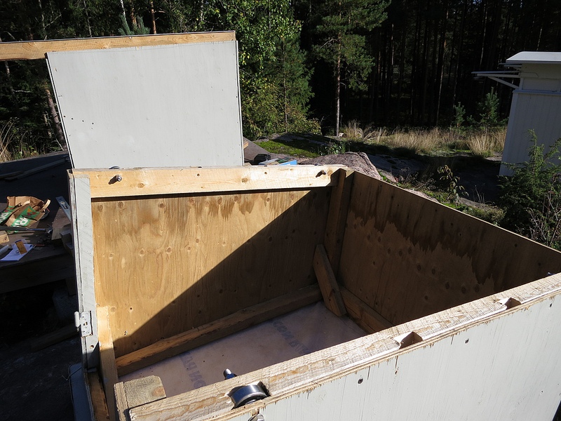 Kun kiskot ja kuulalaakerit olivat valmiina, yläosa nostettiin paikoilleen. Yläosaan kiinnitettiin ohjauslaakerit, jotka estävät sen putoamisen kiskoilta. Yläosa kiinnitetään paikoilleen salvoilla. Ovi katkaistiin sirkkelillä ja jäljellejääneet raot peitettiin filmivanerilla. Lopuksi paljaat puuosat vielä maalattiin ja kopin sisäpinnat käsiteltiin puunsuoja-aineella.
