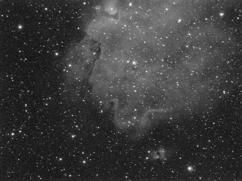 Valitsin ensimmäiseksi kuvauskohteeksi vauvasumuksikin kutsutun IC1848:n “pään” alueen. Valitettavasti ehdin saada vain yhden 20 minuutin valotuksen ennen kuin pilvet vyöryivät paikalle loppuyöksi.