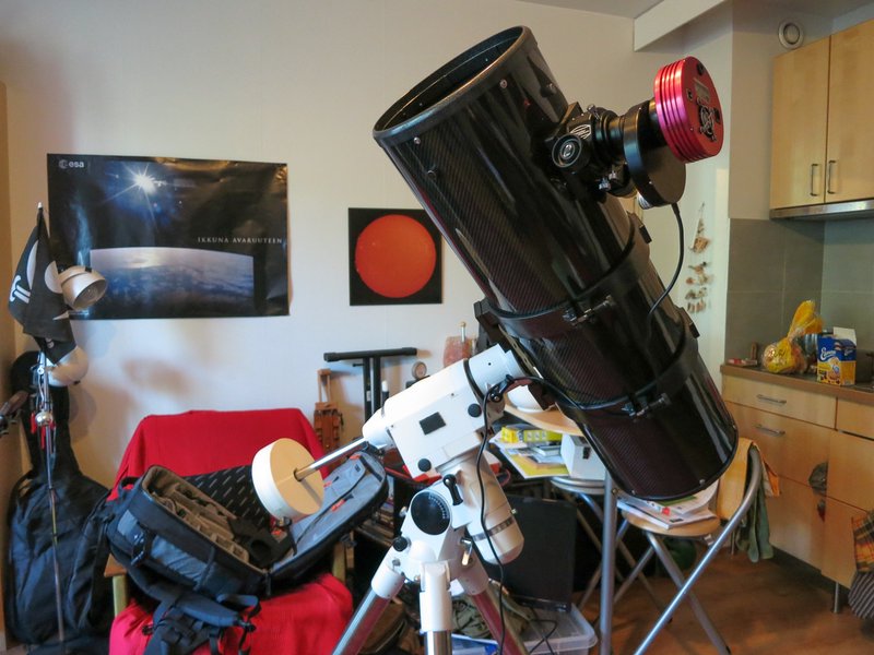 Vaihdoin alkukesästä työpaikkaa, ja pitämättä jääneet lomat vaihtuivat hetkellisesti rahaksi tilille. Raha kuitenkin karkasi pian saksalaiselle Teleskop Servicelle ostettuani heiltä Boren-Simonin 8" f/2,8 PowerNewt -astrografin. Olen jo pidempään kaivannut valovoimaista kuvauskaukoputkea, ja keväällä hankinkin Celestronin C8 -kaukoputken haaveenani käyttää Hyperstaria sen kanssa. Lopulta tulin kuitenkin järkiini ja luovuin Hyperstar-toiveista. Hyperstarin älyttömän valovoiman hintana on tukku vaikeuksia, joiden kanssa en ole valmis painimaan. Hyperstarin kanssa ei voi käyttää filtteripyörää, fokusointi pitää tehdä pääpeiliä säätämällä, kalibrointikuvien ottaminen on vaikeaa koska kamera on optiikan etupuolella ja kamera pitäisi optimitapauksessa olla kapeampi kuin apupeili. Uhraamalla yhden aukon verran valovoimaa näistä kaikista ongelmista pääsi eroon, ja hinta pysyi jotakuinkin samana. Päädyin siis myymään Celestronin ja hankkimaan PowerNewtin.