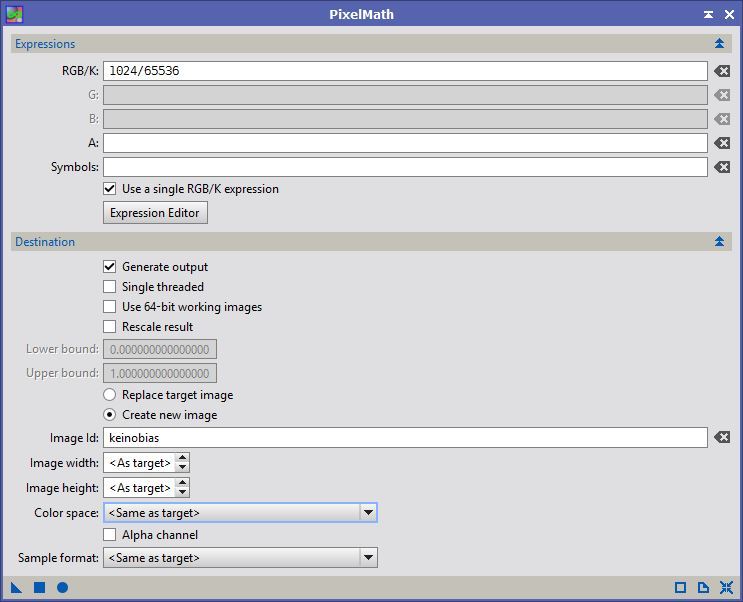 Keinotekoinen bias-kuva luodaan PixInsightin PixelMath-prosessilla. Bias-kuvan kirkkaus määritellään syöttämällä RGB/K-kohtaan lauseke x/65536 missä x on aiemmin mainittu bias-kuvan haluttu kirkkausarvo. Ylläolevan esimerkkikuvan tapauksessa on käytetty arvoa 1024. Myös Create new image -täppä on oltava valittuna. Bias-kuvan koko on helpointa määrittää avaamalla PixInsightiin mikä tahansa kyseisellä järkkärillä otettu raakakuva, ja raahaamalla PixelMath-ikkunan vasemmassa alakulmassa oleva nuoli-ikoni avatun järkkärikuvan päälle. PixelMath kopioi osoitetusta kuvasta parametrit kaikkiin kenttiin joissa lukee ja luo annetun lausekkeen mukaisen kuvan. Vaihtoehtoisesti kentät voidaan täyttää käsin ja ajaa prosessi globaalisti klikkaamalla pyöreää Apply Global -nappia, jolloin erillistä järkkärillä otettua kuvaa ei tarvita.